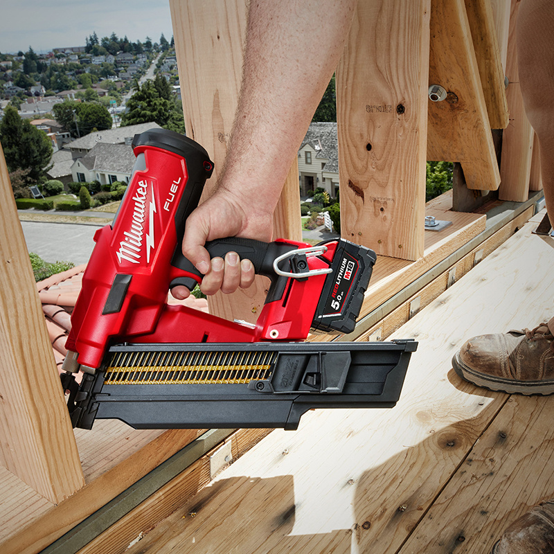 Le cloueur charpentier MILWAUKEE® M18 FFN21-0C garantit des fixations rapides et précises grâce à la technologie "Ready to Fire" et un affleurement uniforme. Il est sans gaz ni entretien et offre jusqu'à 700 clous par charge avec une batterie M18™.