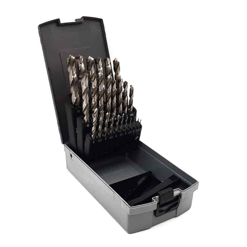 Coffret 25 forets rectifiés HSS-G Ø1 à 13 mm (pas 0,5 mm). Pointe 118°, affûtage croisé, perçage précis sur métaux. Boîte rigide fournie.