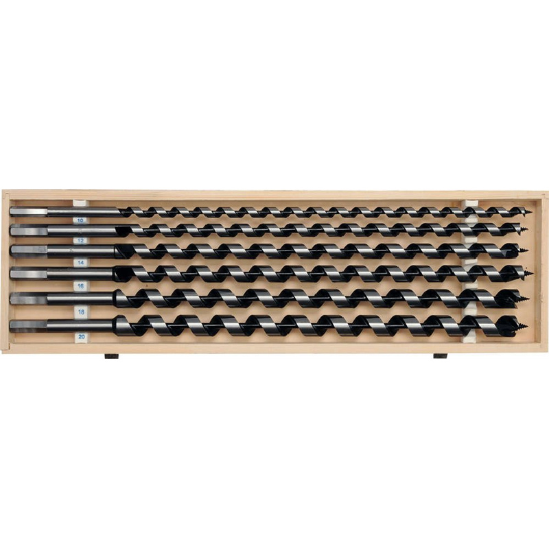 Valise 6 mèches bois Ø 10–20 mm, L 460 mm, emmanchement hexagonal. Pointe autoforeuse, spirales longues. Coffret bois inclus.
