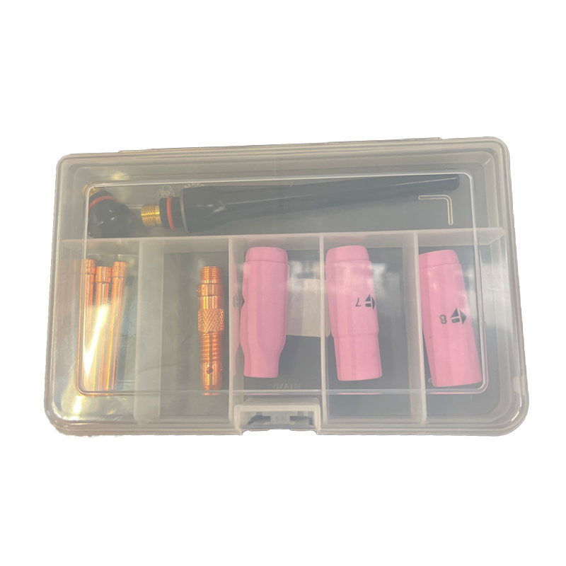 Coffret accessoires torche TIG TG 17/18/26 – WP-26 Kit complet : 3 buses céramique (n°5, 7, 8), 3 pinces (1,6 / 2,4 / 3,2 mm). Inclut 1 diffuseur, 1 coiffe courte et 1 coiffe longue. Livré en coffret de rangement pratique et robuste.
