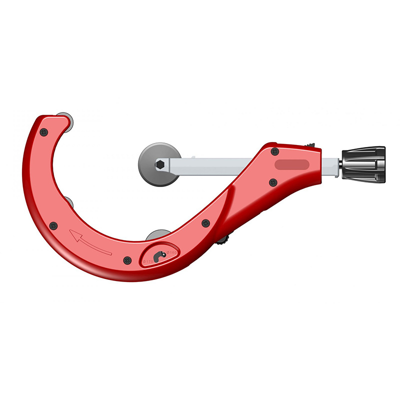 Coupe-tubes plastique Ø50–127 mm Corps aluminium léger. Avance rapide + ébavureur intégré. Molette interchangeable sans outil (ICS). 3 rouleaux de guidage dont 1 réglable (110 / 127 mm).