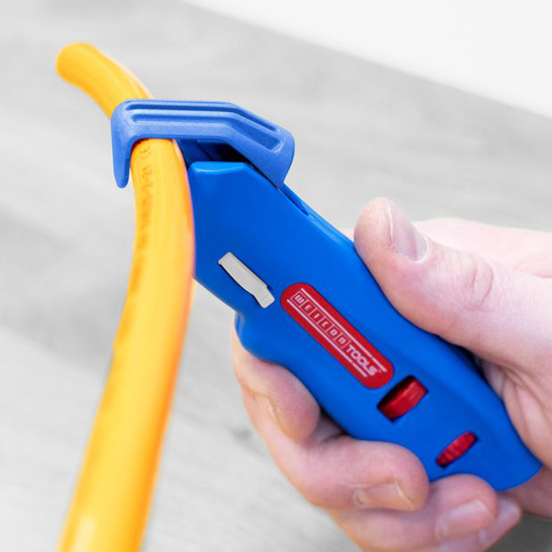 Sa lame rotative auto-rétractable assure une protection maximale de l’utilisateur : en cas de mauvaise manipulation, elle se rétracte instantanément pour éviter les blessures. Grâce à sa molette de réglage verrouillable, la profondeur de coupe s’ajuste avec une précision millimétrée (de 0 à 3 mm par paliers de 0,1 mm), ce qui permet de préserver l’intégrité des conducteurs internes, même en présence d'isolations épaisses ou délicates.