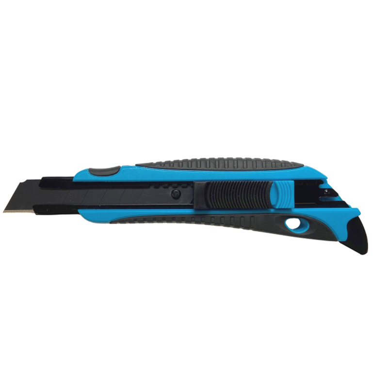 Cutter Cut&Open 18mm, poignée bimatière Softgrip. Double sécurité et embout multifonctions guide lame. Lame renforcée antirouille et anti-adhésive fournie.