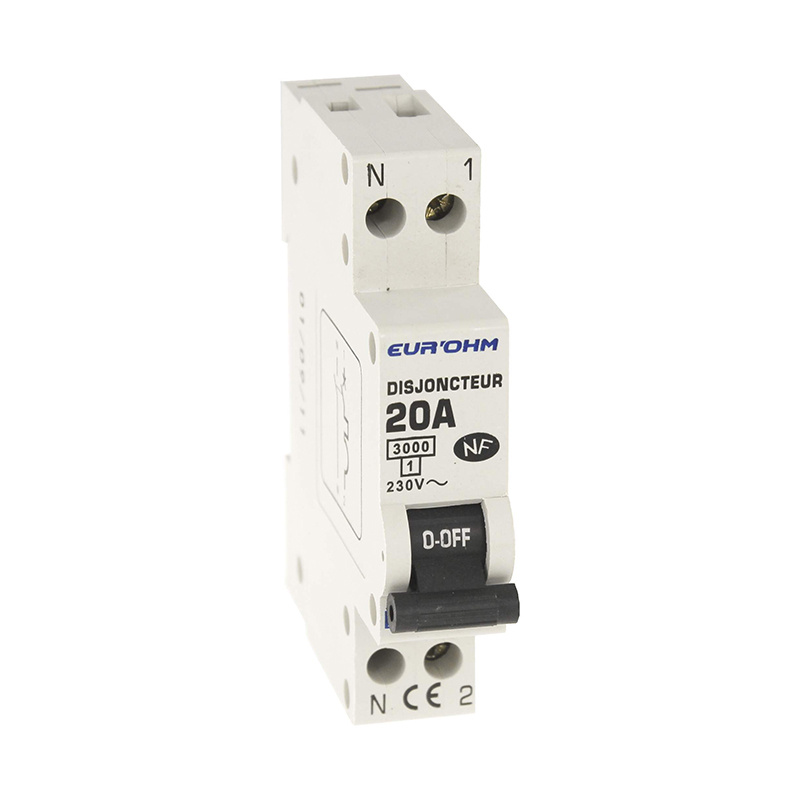Disjoncteur 1P+N Courbe C 20A Eur’ohm Protection fiable contre surcharges et courts-circuits pour prises et éclairage. Installation facile dans tableaux modulaires à vis, bornes à vis sécurisées. Pouvoir de coupure 3 kA, certifié NF/CE, fonctionne de -25°C à +70°C.