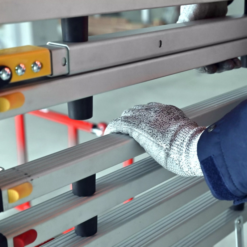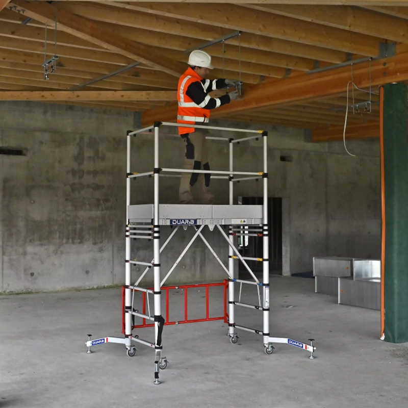 Échafaudage 100% télescopique, réglable tous les 25 cm avec 7 hauteurs de travail. Montage rapide et sécurisé par un seul opérateur. Compact et léger, il se range facilement dans un petit utilitaire. Plancher aluminium avec trappe et plinthes amovibles. 4 stabilisateurs intégrés et roues Ø 100 mm à frein. Charge admissible : 150 kg. Fabrication robuste et conforme aux normes de sécurité (Décret 2004-924).