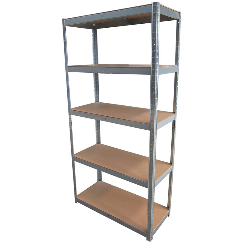 Étagère de rangement 5 niveaux avec structure métallique et tablettes en MDF à emboîter. Capacité de charge jusqu’à 1250 kg, idéale pour atelier ou garage. Montage simple et sans vis.