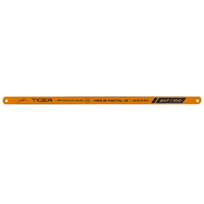 Lames scie métaux HSS bi-métal 300 mm – 24T Tiger Denture ondulée, coupe droite sans bavure Haute résistance à l’échauffement et flexibilité optimale Étui de 10 lames, usage intensif pour métaux