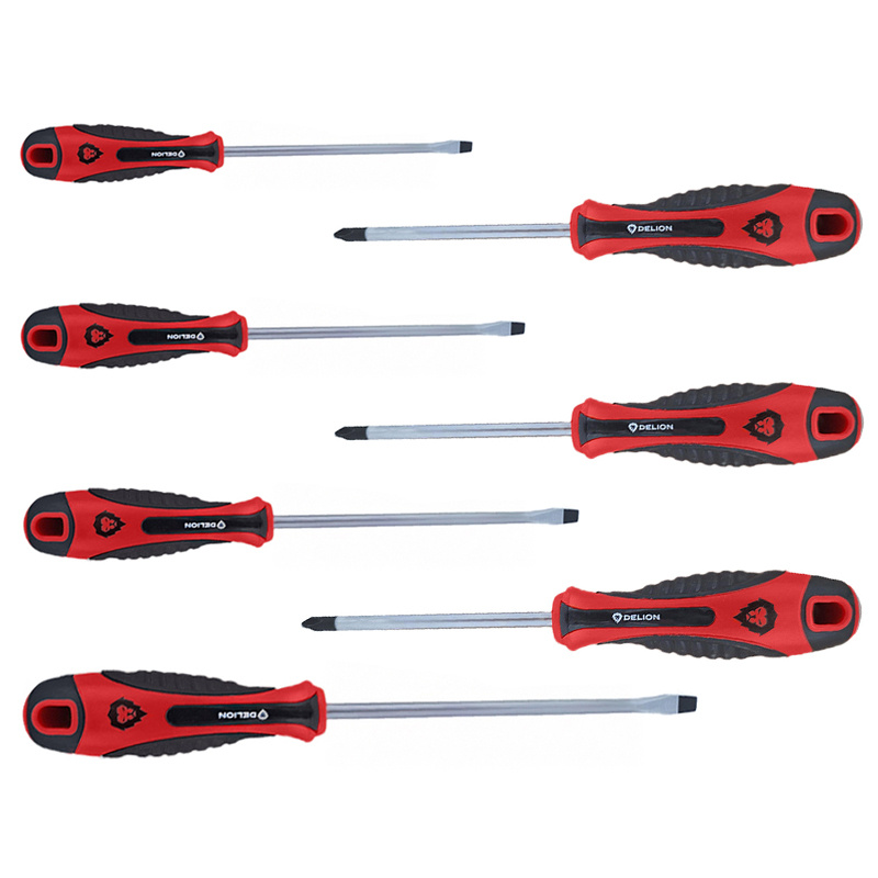 Jeu 7 tournevis DELION ERGO Manches bi-matière ergonomiques haute résistance. Repère empreinte au bout du manche. Plats, PH et PZ pour travaux tous corps d'état.