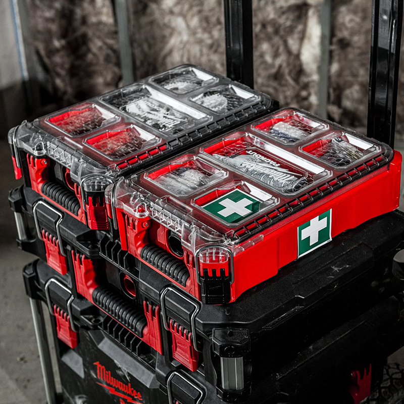 Kit de 1er secours PACKOUT™ DIN 13157 Boîtier rouge IP65, ultra-résistant et empilable PACKOUT™ Contenu complet normes DIN 13157 – 5 bacs modulables Idéal chantiers, ateliers, industrie – Format compact & visible