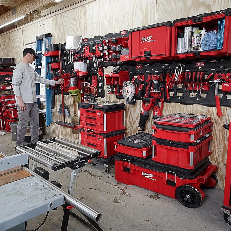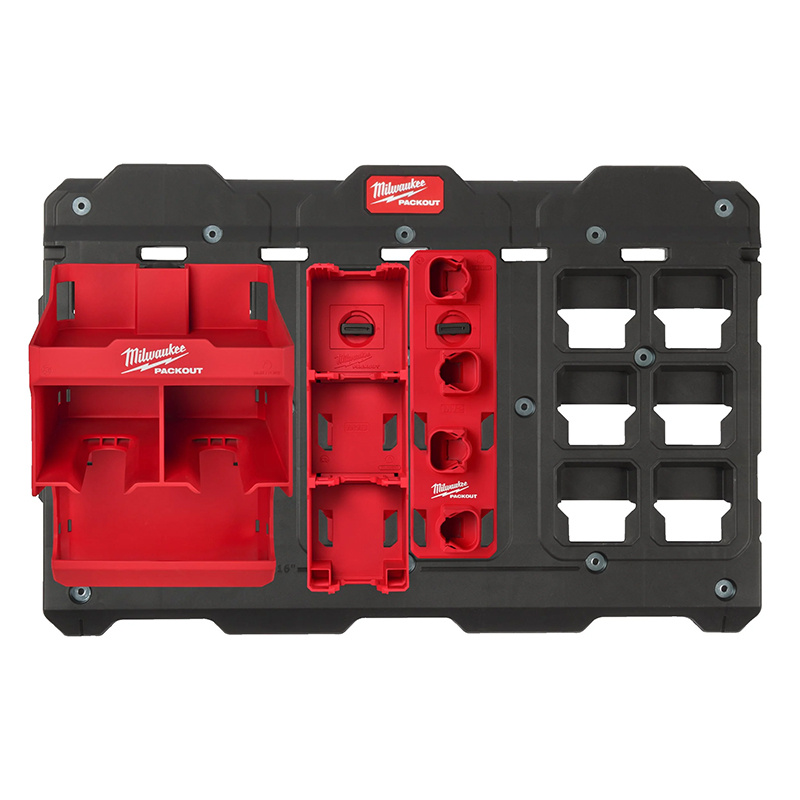 Le Kit Starter PACKOUT™ Milwaukee® comprend une plaque de montage XL résistante aux chocs, capable de supporter jusqu’à 70 kg. Elle se fixe facilement sur les murs ou dans un véhicule grâce à ses points d'attache en métal. Idéale pour organiser vos outils et fournitures de manière solide et fiable.