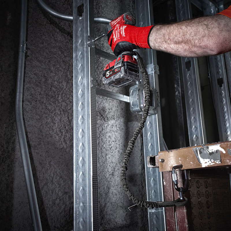 La lanière de sécurité noire MILWAUKEE® (capacité 6,8 kg) réduit l'impact des chutes d'outils grâce à son système d'absorption des chocs. Elle dispose d'un double mousqueton semi-automatique pour une connexion sécurisée et d'un pivot intégré pour plus de mobilité. Sa capacité de poids est facilement identifiable grâce au code couleur.