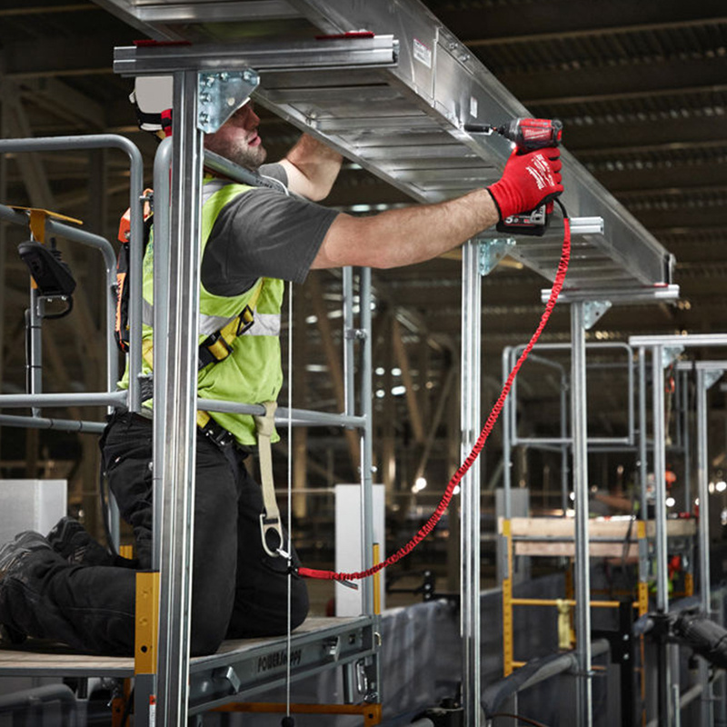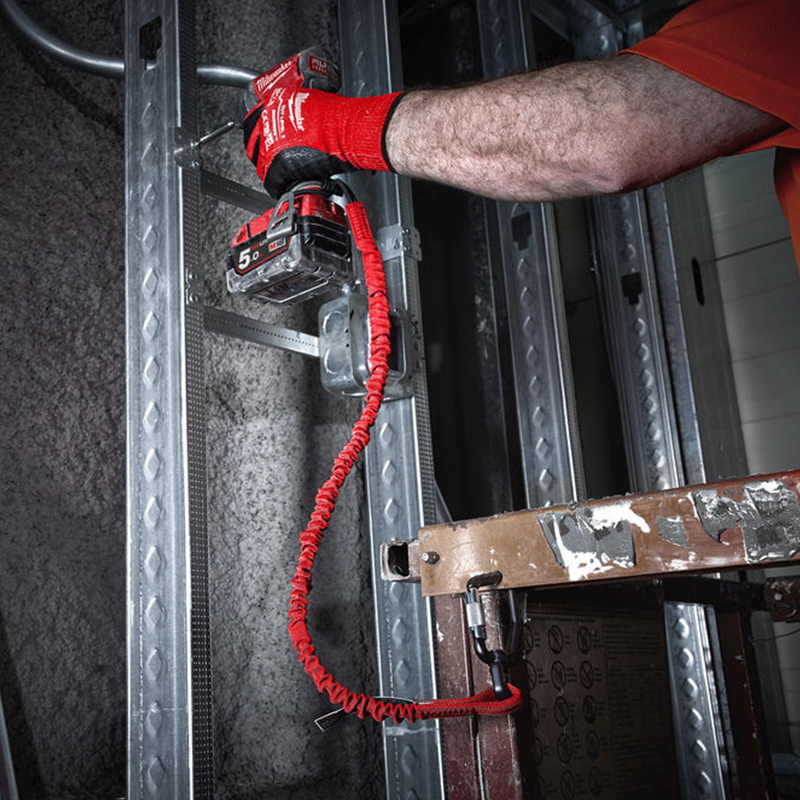 La lanière de sécurité rouge MILWAUKEE® (capacité 4,5 kg) protège contre les chutes en absorbant les chocs grâce à son système de ralentissement progressif. Elle est équipée d'un double mousqueton semi-automatique et d'un pivot intégré pour plus de mobilité et de sécurité.