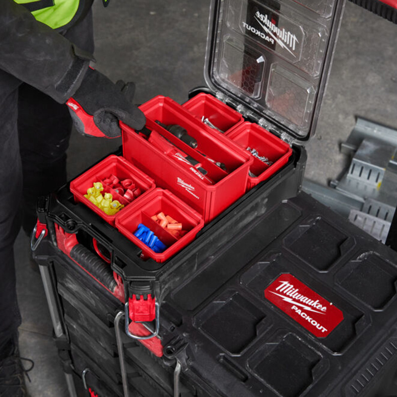 Le Lot de 2 Bacs PVC PACKOUT™ Milwaukee® permet un rangement pratique pour petits accessoires comme tournevis et bandes. Livré avec diviseurs amovibles et compatible avec le système PACKOUT™. Conçu en polymère résistant aux chocs pour une durabilité optimale.