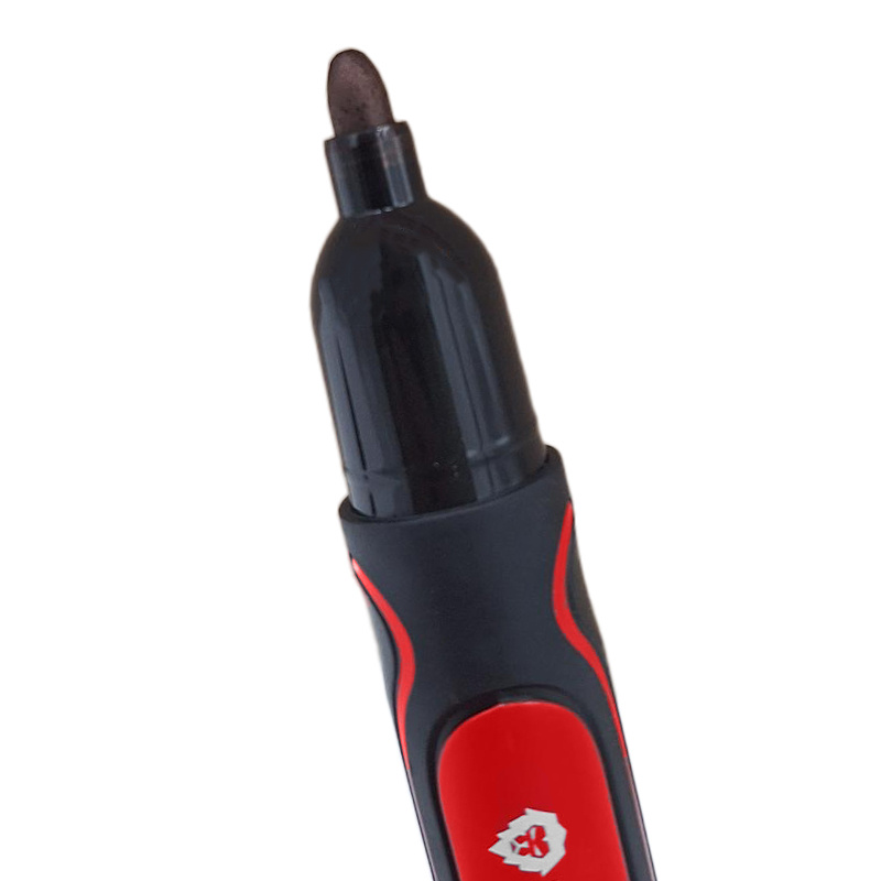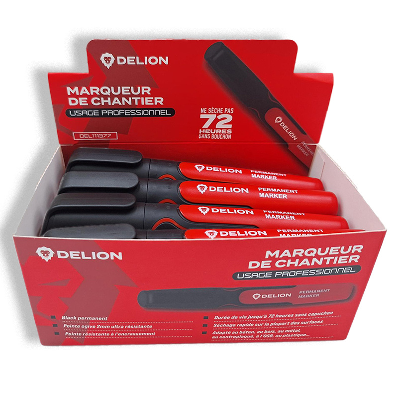 Marqueur indélébile noir DELION – Pointe 2 mm. Encre noire permanente à séchage rapide, jusqu’à 72 h sans capuchon. Écrit sur béton, bois, métal, plastique, OSB, contreplaqué. Grip souple, grande contenance – à l’unité ou boîte de 12.