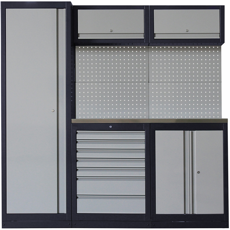 Le Mobilier d'Atelier Pro 5 Éléments offre une solution complète et fonctionnelle pour organiser votre espace de travail. Il inclut des meubles avec tiroirs, étagères, panneaux porte-outils perforés et un plateau inox, le tout avec une installation facile et sécurisée. Parfait pour les professionnels cherchant à optimiser leur atelier.
