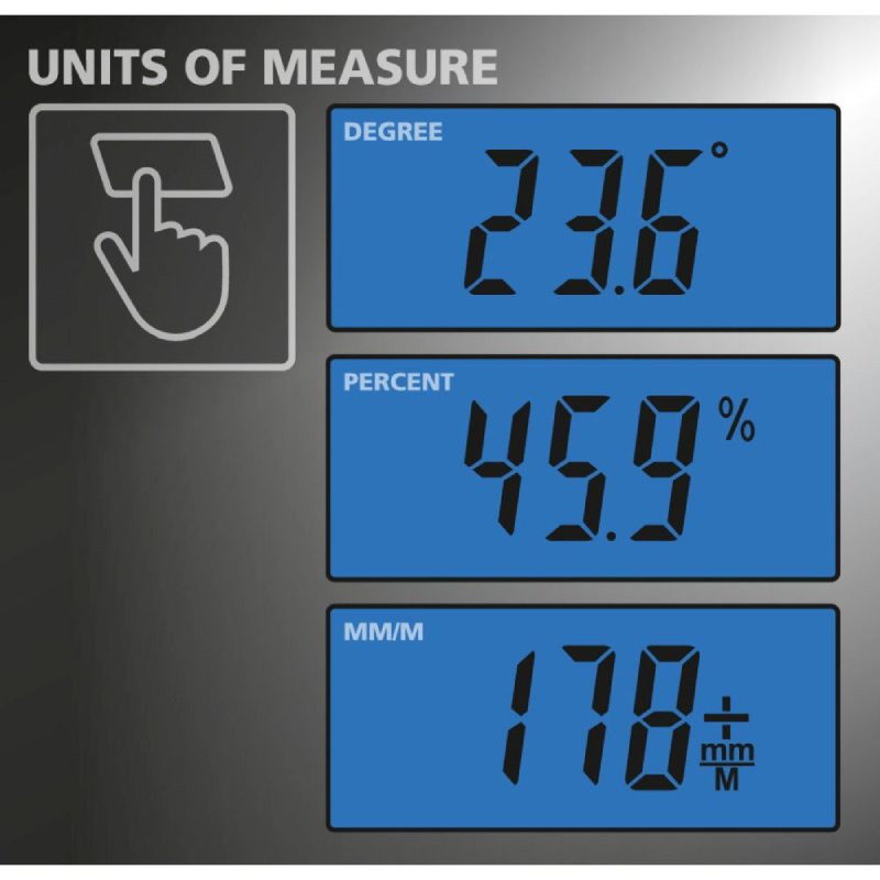 de mesure : 0° à 360° avec affichage en degrés, pourcentage ou mm/m.