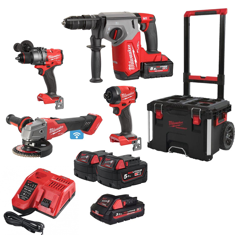 Le pack Quatro Milwaukee® M18 FPP4AE-533P offre des outils puissants et polyvalents : visseuse à percussion, visseuse à choc, perforateur-burineur et meuleuse. Avec deux batteries High Output 5.5Ah et une 3.0Ah, il garantit une autonomie prolongée, tandis que le chargeur rapide et le coffre trolley Packout facilitent le transport et l’organisation sur chantier.