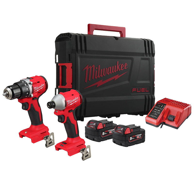 Pack M18 BLCPP2B-502C Milwaukee® Brushless 18V. Perceuse + visseuse à choc compactes, puissantes et durables. 2 batteries 5.0 Ah REDLITHIUM™, chargeur rapide M12-18C. Coffret de transport robuste inclus – idéal chantier pro.