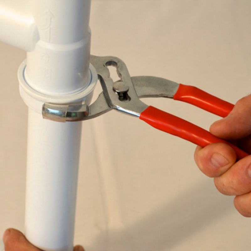 Pince Sanigrip Ø14-62. Pour serrage et desserrage d’écrous sanitaires difficiles d’accès. Mâchoires arrondies et mors plastique pour protéger siphons et manchons. 3 positions de réglage, longueur 250 mm.