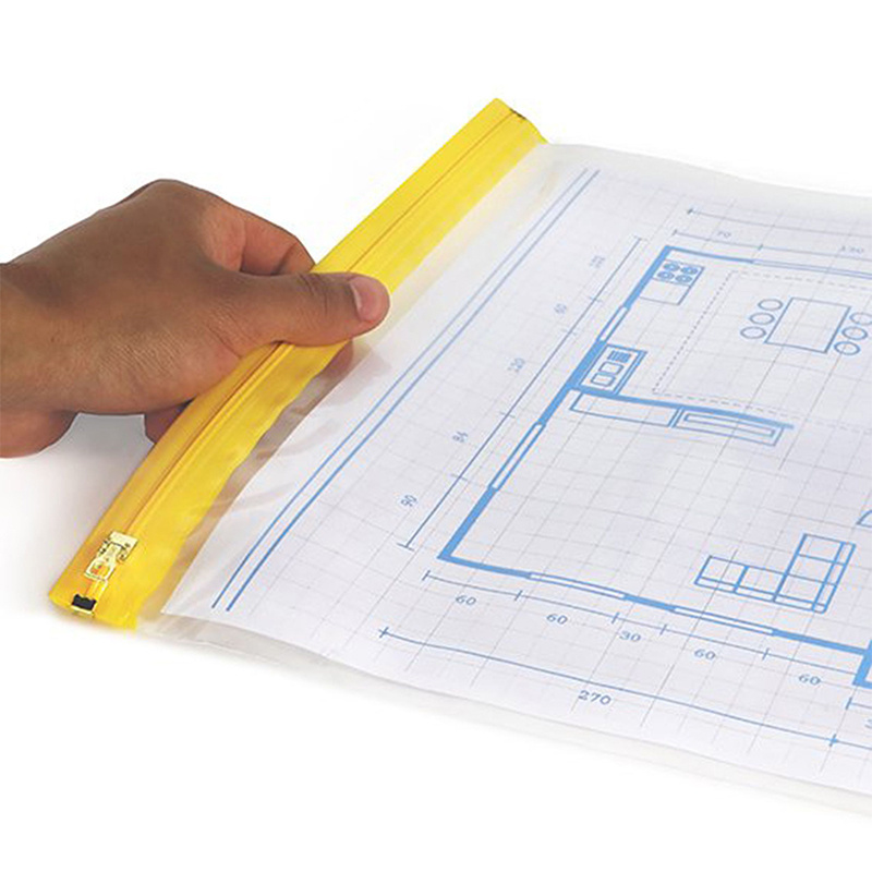 Pochette protège plans A0 900 x 1280 mm, transparent/jaune, PE 90 µm. Imperméable, résistante aux salissures, avec fermeture par curseur coulissant. Idéale pour chantiers, bureaux et transport de documents grands formats.