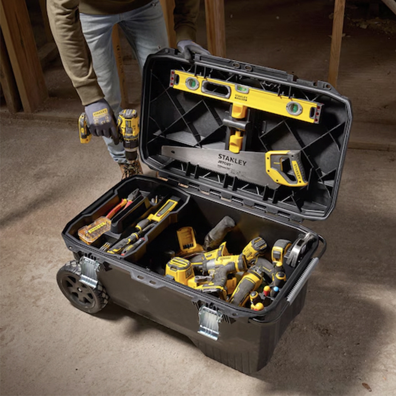 Roulotte de chantier Stanley FatMax 113L. Volumes généreux et étanchéité pour protéger vos outils. Poignée télescopique et poignée arrière pour un transport facile. Système de verrouillage sécurisé et organisateur vertical amovible.