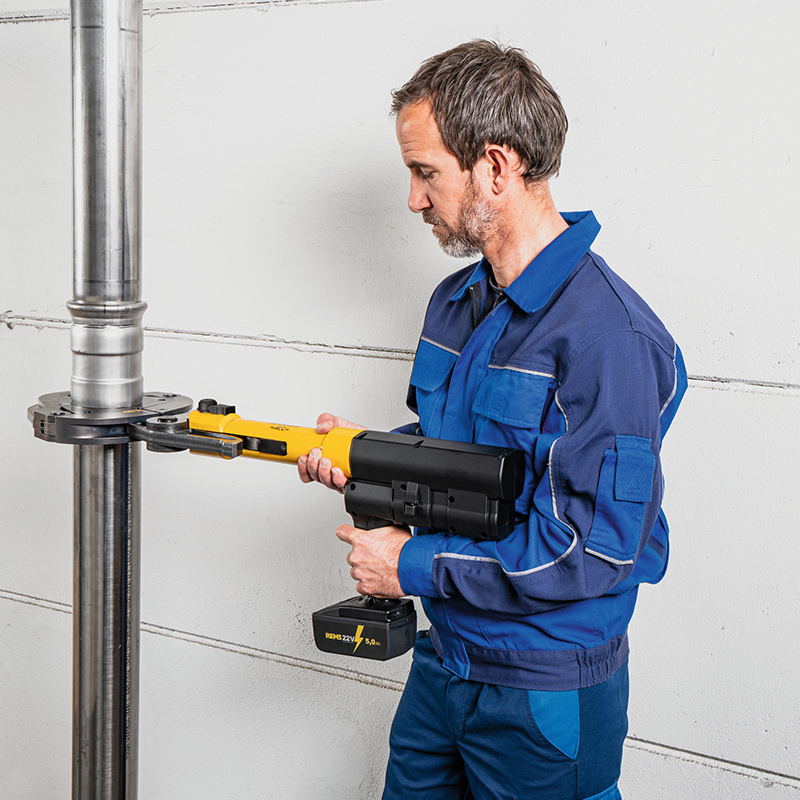 Sertisseuse REMS Akku-Press XL ACC 22V/5A Puissante (45 kN), idéale pour sertissage jusqu’à Ø 108 mm. Batterie 21,6 V – Moteur 380 W – Autonomie élevée. Livrée avec valise, pince XL, chargeur et batterie.