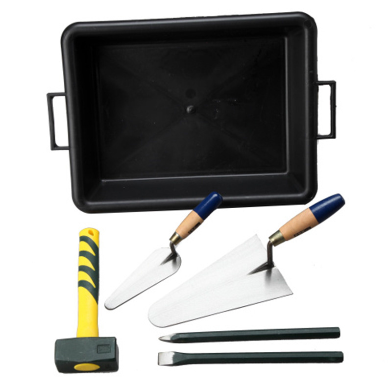 Set Bâtiment 1 : kit de maçon complet. Gamme PVC 10L, truelles, massette, burins. Idéal chantiers de maçonnerie et gros œuvre.